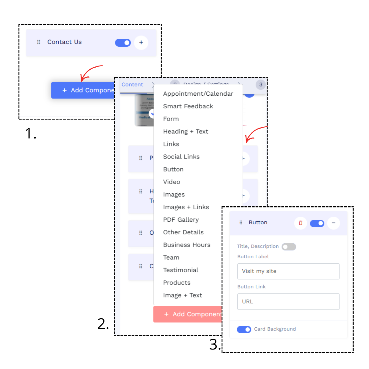 Kies onderaan voor "+ Add Component" en selecteer de optie "Button".