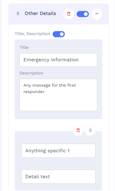 Bij het element Other details kan je belangrijke medische informatie invullen. Denk hierbij aan medicijnen die je gebruikt en hoe vaak je die inneemt, of een medische aandoening of allergie voor bepaalde stoffen en/of medicijnen. Deze informatie kan van groot belang zijn voor de hulpdiensten om zo snel mogelijk de juiste hulp te bieden.